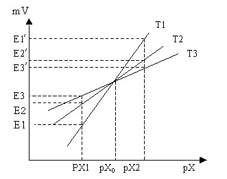 如果標(biāo)準(zhǔn)溶液和被測溶液的溫度不同時,就必須進(jìn)行等電位補償,否則會帶來較大的測量誤差。測試離子選擇電極等電位點的方法是取兩個(或兩個以上)不同的標(biāo)準(zhǔn)溶液(pX1,pX2)用mV擋測量它們在不同溫度下的電位值(一般做三個以上不同的溫度)。從一個溫度變?yōu)榱硪粋溫度測量時,一定要待電極達(dá)到溫度平衡狀態(tài)后,才能進(jìn)行測量,然后以不同溫度下測得的數(shù)據(jù)作圖,(圖3)中直線的交點就是測得的等電位點,對應(yīng)橫座標(biāo)軸上的值就是等電位pX值。