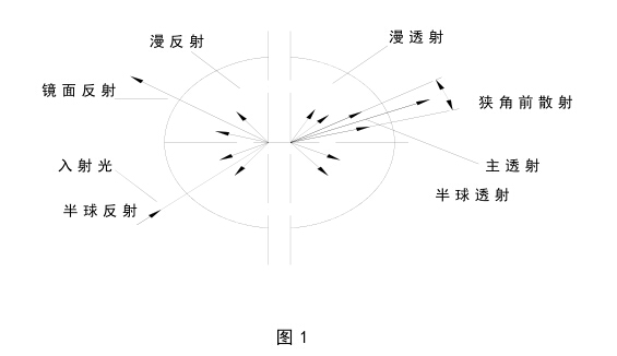 如圖1所示,光線射到一透明或半透明物體上時(shí),部分產(chǎn)生定向反射,部份產(chǎn)生漫反射,進(jìn)入樣品合部份被吸收,部分被透過,出射樣品的光中,主透射部份按折射定律前進(jìn),部份產(chǎn)生半球透射,其前進(jìn)方向是散亂的。
