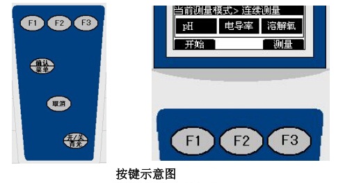 本儀器共有 6 個(gè)按鍵,分別為 F1 鍵、F2 鍵、F3 鍵、確認(rèn)/菜單鍵、取消鍵、開/關(guān)/背光鍵等。
