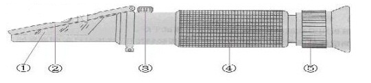 折光棱鏡 ②、蓋板 ③、校準(zhǔn)螺栓④、光學(xué)系統(tǒng)管路 ⑤、目鏡(視度調(diào)節(jié)環(huán))