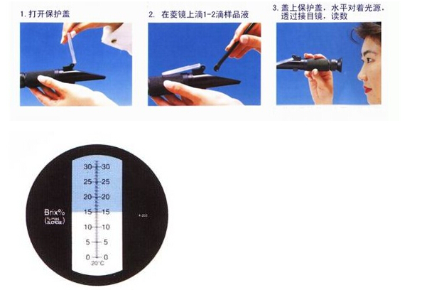 打開蓋板,用紗布或卷紙將水擦干,然后如上法在棱鏡玻璃面上滴2滴果蔬汁,進(jìn)行觀測(cè),讀取視野中明暗交界線上的刻度,即為果蔬汁中可溶性固形物含量(%)(糖的大致含量)。重復(fù)三次。