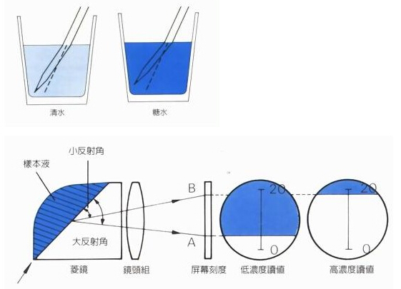光線從一種介質(zhì)進(jìn)入另一種介質(zhì)時(shí)會(huì)產(chǎn)生折射現(xiàn)象,且入射角正弦之比恒為定值,此比值稱為折光率。果蔬汁液中可溶性固形物含量與折光率在一定條件下(同一溫度、壓力)成正比例,故測(cè)定果蔬汁液的折光率,可求出果蔬汁液的濃度(含糖量的多少)。