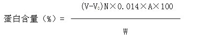 用0.1N HCl滴定接收瓶?jī)?nèi)的溶液,滴定溶液由綠色變成淡紫色時(shí)為止,記下消耗HCl的毫升數(shù),按下式計(jì)算蛋白含量: