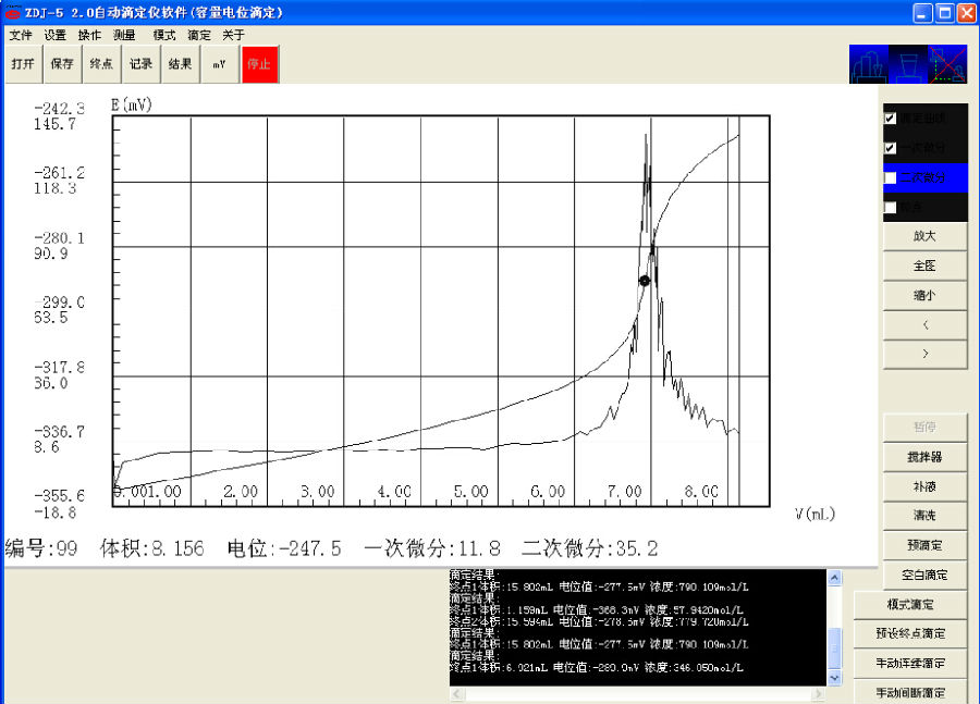 準(zhǔn)確稱取雙甘膦0.18g(精確至0.0002g)于50ml滴定杯中,放入攪拌珠,加入三乙醇胺5ml,緩沖溶液20ml。儀器自動(dòng)判別滴定終點(diǎn),顯示測(cè)試結(jié)果。