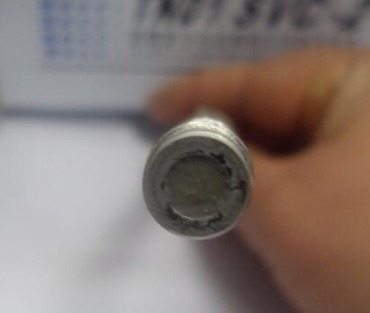 這時,色譜圖還是有點拖尾,卸開色譜柱進口螺帽,看污染情況,如下圖:(柱頭填料污染)