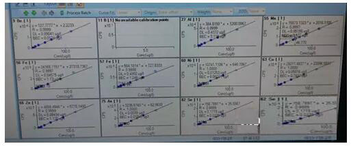 依次將標準系列溶液引入到等離子體中進行標準曲線的測定,再將所有樣品直接進樣分析,標準曲線如下圖: