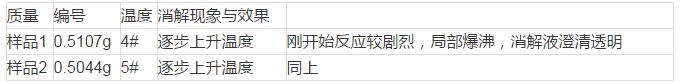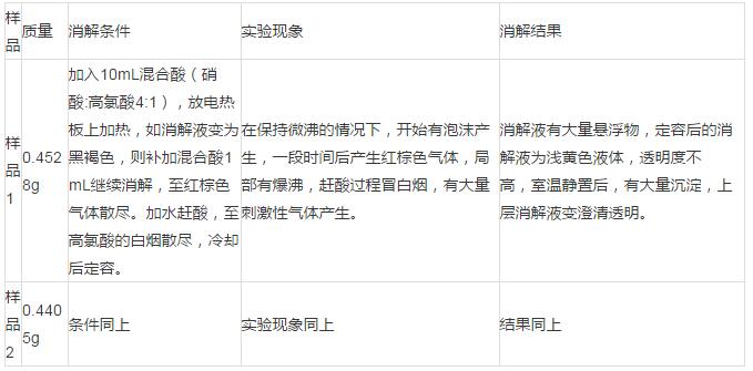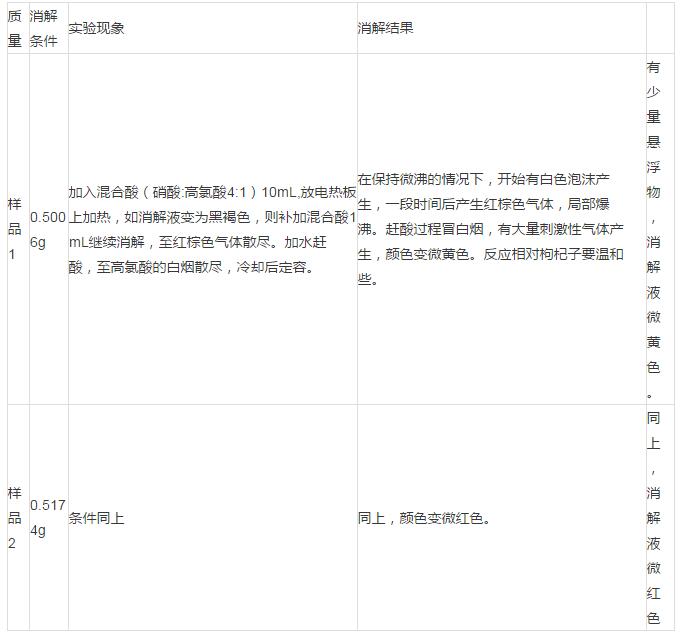 1.濕法消解,加入混合酸10mL進(jìn)行消解,消解過程相當(dāng)耗時,并且難于控制。消解過程中消解液很容易變?yōu)楹诤稚�,需要補(bǔ)加混合酸,得到的消解液有少量懸浮物,呈微黃色或微紅色。