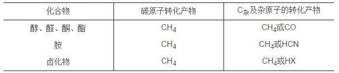 2、對(duì)非烴類化合物,其響應(yīng)機(jī)理比較復(fù)雜,隨所含官能團(tuán)的不同而異,基本規(guī)律是不與雜原子相連的碳原子均轉(zhuǎn)化成甲烷。雜原子及其相連的碳原子(C雜)的轉(zhuǎn)化產(chǎn)物見(jiàn)下表。
