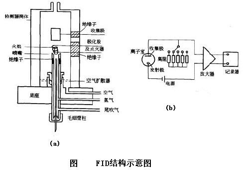 氫火焰離子化檢測(cè)器(FID)由電離室和放大電路組成,分別如下圖 (a),(b)所示。