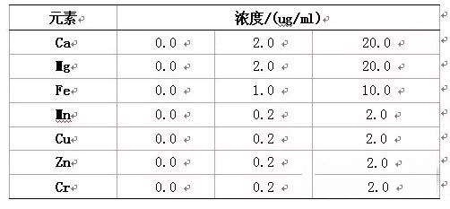用1.0mg/mL 的Ca、Mg、Fe、Cu、Zn、Mn、Cr元素的標(biāo)準(zhǔn)溶液,逐級(jí)稀釋,配制混合標(biāo)準(zhǔn)溶液。