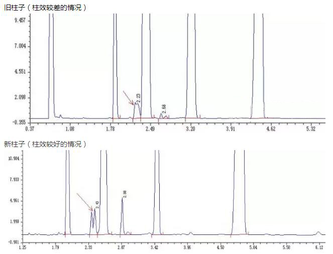 這次用的是DB-1,這個(gè)柱子相信大家的實(shí)驗(yàn)室都有,太常用了,圖上箭頭指出的峰也是順反式異構(gòu)體(都經(jīng)過對(duì)照品定性過),是不是可以作為評(píng)價(jià)柱子狀態(tài)好壞的依據(jù)?分離度的差別還是很明顯的。