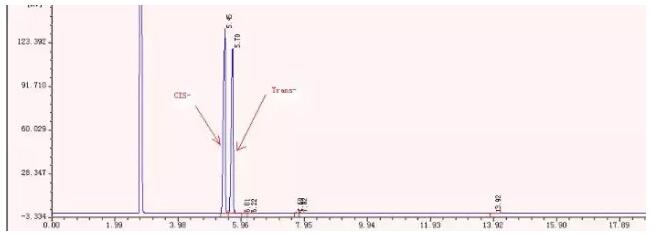 如圖上所示,5.45min和5.70min的兩個(gè)峰就是順反異構(gòu)體(已經(jīng)過對(duì)照品和GC-MS定性),從圖上看二者分離度良好,幾乎基線分離。這個(gè)例子是個(gè)特例,是屬于那種用常規(guī)柱子就可以完全分離順反異構(gòu)體的例子,記�。翰皇撬械捻樂串悩�(gòu)體都可以用17ms這種常規(guī)柱子分開的,實(shí)際工作中好多是分不開的。