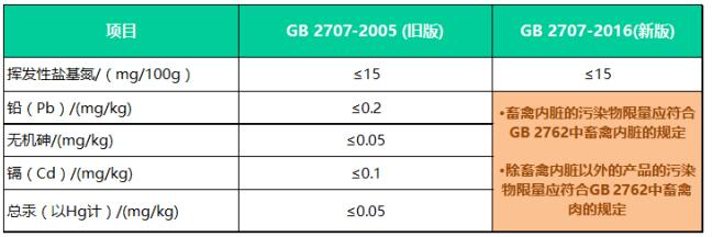 2、GB2707-2016中依舊保留了揮發(fā)性鹽基氮的限量指標(biāo),檢測方法為GB5009.228。而污染物限量、農(nóng)藥殘留限量和獸藥殘留限量分別參照國家標(biāo)準(zhǔn)。