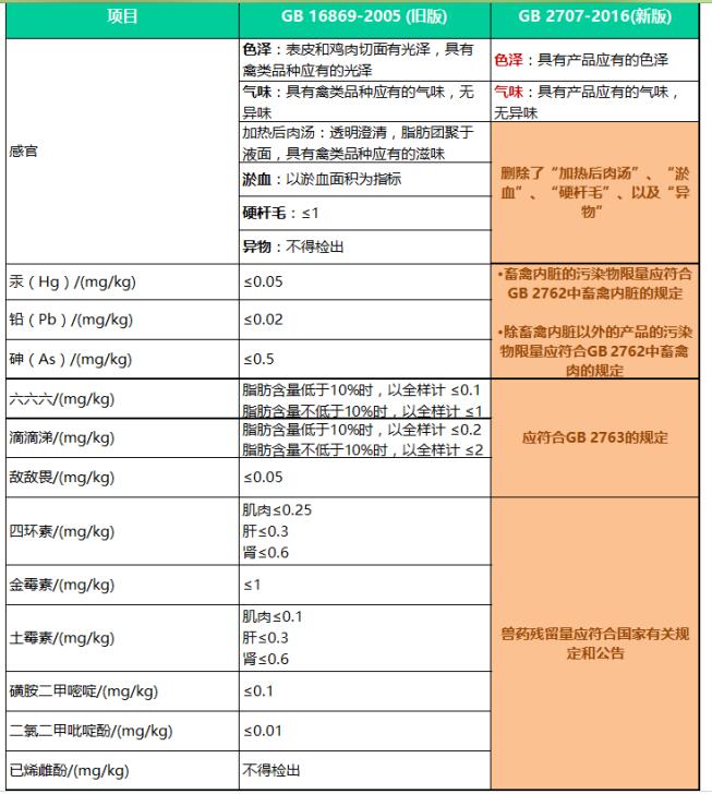 3、GB2707-2016中色澤和氣味有所變化,并且刪除了感官項(xiàng)目中“加熱后肉湯”、“淤血”、“硬桿毛”和“異物”的限量。