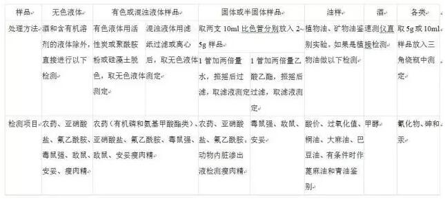 常見的中毒物質主要有農藥(有機磷和氨基甲酸酯類)、鼠藥(毒鼠強、氟乙酰胺、敵鼠、安妥)、亞硝酸鹽、甲醇、砷和汞、氰化物、非食用油和酸敗油脂等等�,F(xiàn)場操作時,可視不同的物質采取不同的處理方法測定一個系列的項目。這樣可以免去許多樣品前處理的重復操作,降低工作量,提高工作效率。步驟如下: