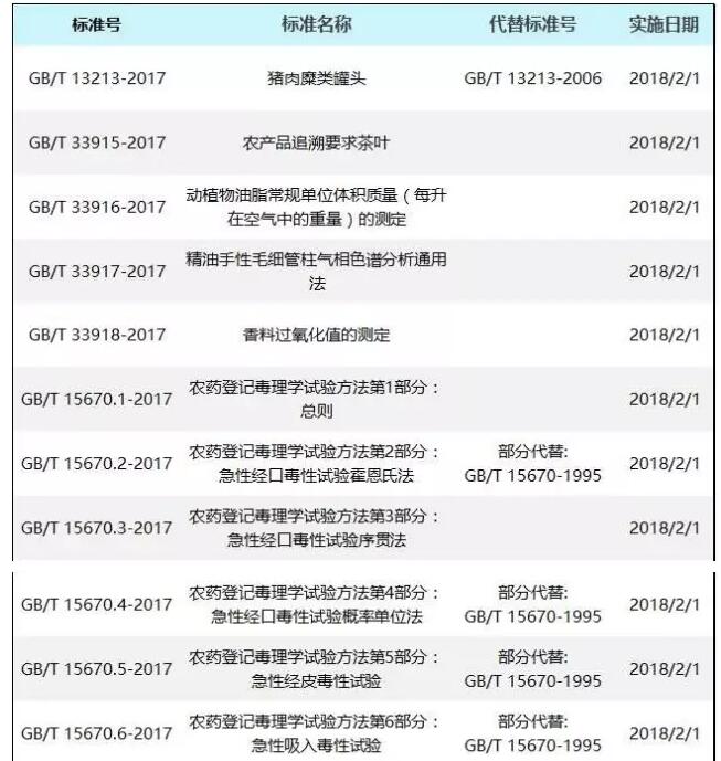 2017年7月12日,國家質(zhì)量監(jiān)督檢驗檢疫總局、國家標準化管理委員會發(fā)布批準關(guān)于農(nóng)藥、食品等行業(yè)相關(guān)標準34項。