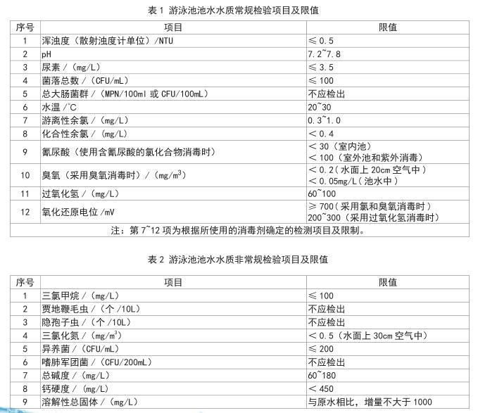 內(nèi)容:規(guī)定了室內(nèi)外公共游泳場所的建設(shè)衛(wèi)生要求、設(shè)施設(shè)備要求、日常運(yùn)行管理要求及水質(zhì)衛(wèi)生和游泳館空氣等標(biāo)準(zhǔn)值及檢測方法。游泳場所應(yīng)配備檢測余氯、渾濁度、pH值、池水溫度等直讀的檢測設(shè)備,并保持計(jì)量準(zhǔn)確。每場開放前、室內(nèi)游泳場所每兩小時(shí)、室外游泳場所每小時(shí)均應(yīng)進(jìn)行池水游離性余氯、渾濁度、pH值、池水溫度等指標(biāo)自檢。
