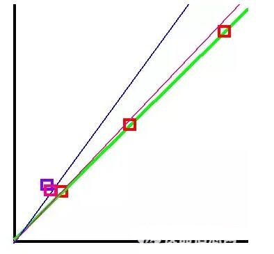 這個(gè)固定誤差非常關(guān)鍵。因?yàn)樵诓煌瑵舛认�,這個(gè)誤差是固定的,所以測(cè)量點(diǎn)帶上這個(gè)固定誤差,就相當(dāng)于下圖中的紅色方塊了。本來(lái)理想的響應(yīng)曲線(xiàn),或者說(shuō)我們標(biāo)定得到的工作曲線(xiàn),應(yīng)該是綠色線(xiàn)。但因?yàn)閱未螠y(cè)量存在這樣一個(gè)固定的誤差,因此我們?cè)谧畈恍业那闆r下可能實(shí)際得到的是藍(lán)色和粉色線(xiàn)。