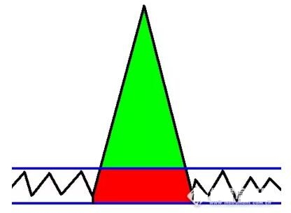從這個(gè)圖中,兩條蘭線(xiàn)之間的黑色折線(xiàn)是色譜基線(xiàn)。我們知道,色譜的基線(xiàn)總是有一定寬度的,當(dāng)色譜峰出來(lái)后,在正確的積分條件下,藍(lán)線(xiàn)上面的綠色面積一定會(huì)得到準(zhǔn)確積分。但基線(xiàn)寬度內(nèi)的紅色部分,就不確定了。