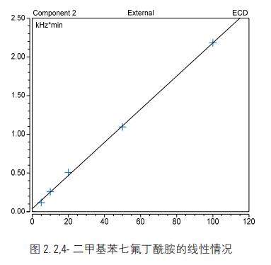 在選定的色譜條件下,標準品衍生后的色譜圖見圖1另一離心管中,加七氟丁酸酐10μL,混勻,于60℃恒線性關(guān)系及測定低限:準確移取2,4-二甲基苯胺標準中間液適量,用正己烷稀釋,分別配制得到濃度為0、5、10、20、50、100μg/L的標準工作液,各取2.0mL,按衍生化步驟處理,供氣相色譜測定。以測定峰面積為縱坐標,對應(yīng)的標準溶液濃度為橫坐標,繪制標準曲線如圖2。方法檢出限以3倍信噪比計算得到,本方法的測定低限為2μg/kg。