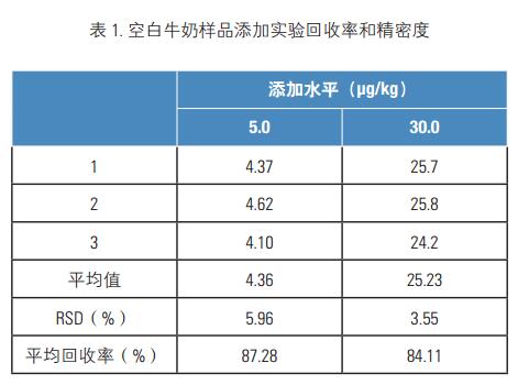 樣品中的雙甲脒在酸性條件下水解為2,4-二甲基苯胺,堿化后用正己烷提取,衍生后采用賽默飛世爾新型的氣相色譜儀檢測,外標法定量。結(jié)果表明,雙甲脒的平均回收率為84.1-87.3%,3次平行測定的RSD值≤5.96%,方法測定低限為2ng/g。此法操作簡單,科學(xué)準確,靈敏度高,能夠滿足牛奶中雙甲脒的殘留分析要求。